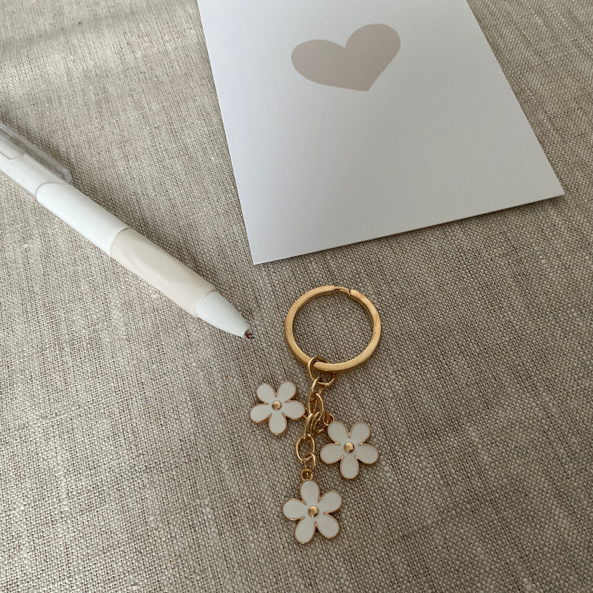 Nooit meer je sleutels kwijt? Koop dat deze te leuke sleutelhanger of geef hem cadeau. De sleutelhanger is van goudkleurig metaal met wit geëmailleerde bloempjes.