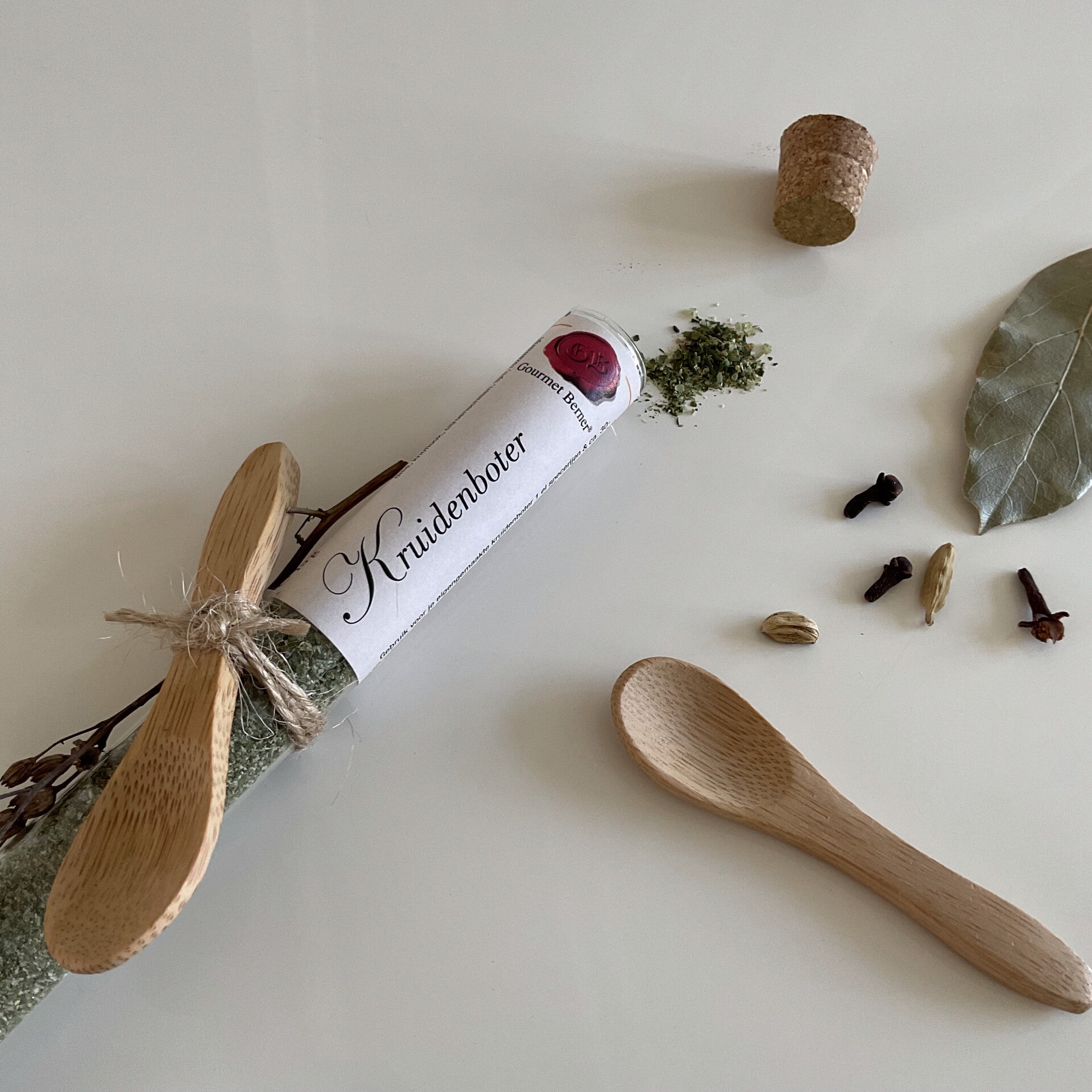 Heerlijke kruiden om zelf kruidenboter te maken. En heel leuk verpakt in een mooi glazenflesje met kurk dopje en een handig mooi houten lepeltje en takje zijn toegevoegd zodat het echt een cadeautje is om te geven.