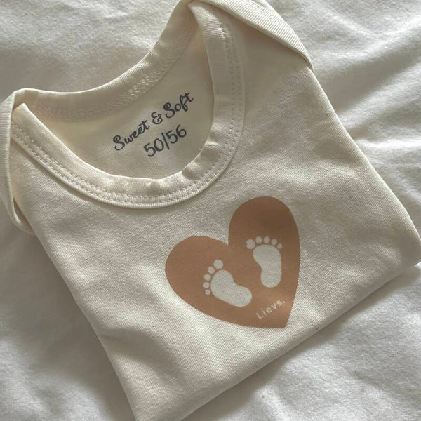 Het rompertje is van 100% katoen in de maat 62/68 en voorzien van een opdruk in de vorm van een hartje met twee kleine voetjes en de tekst Lievs.