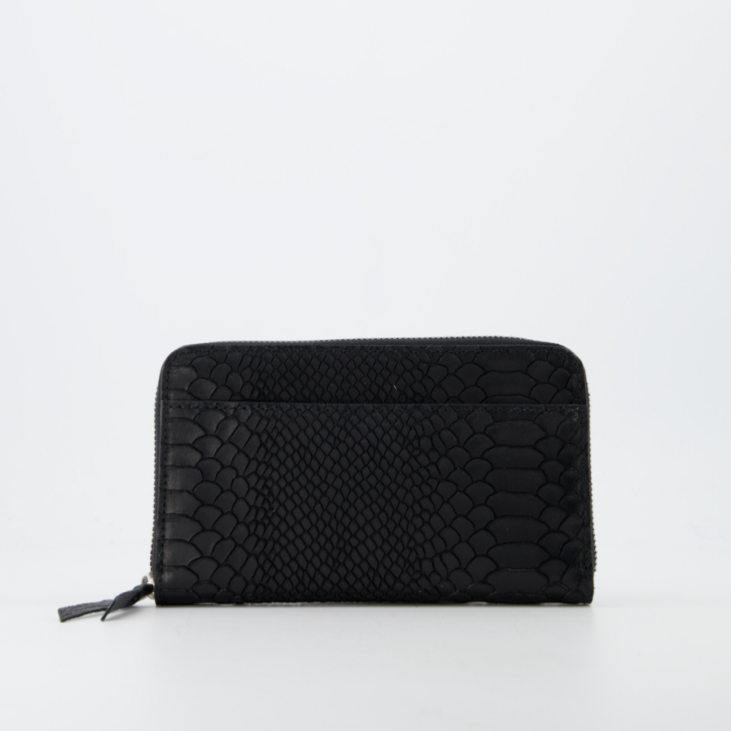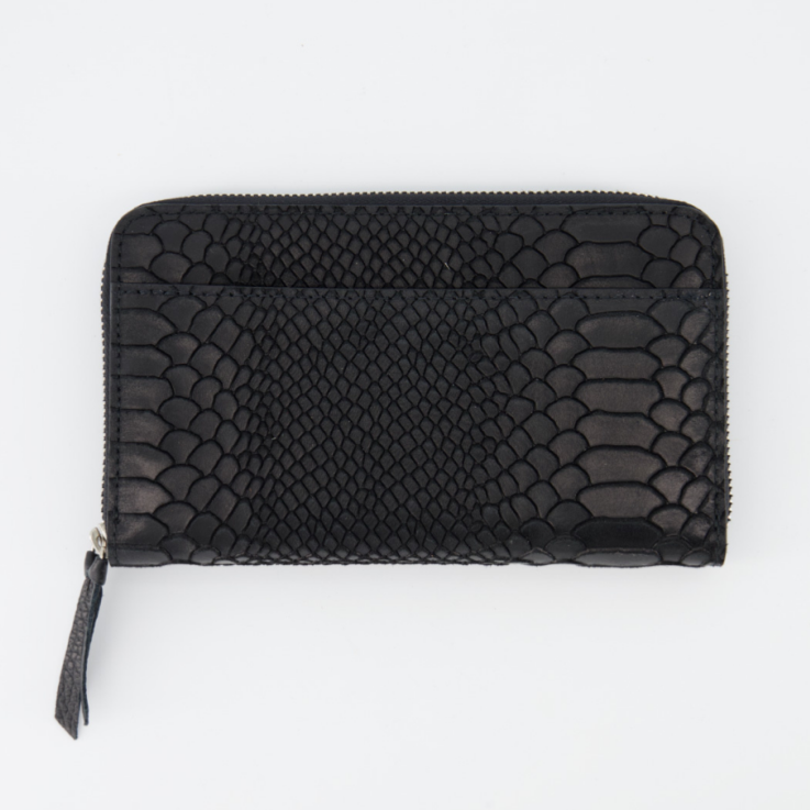 Leren portemonnee met Snake uitvoering. De portemonnee heeft een vakje en ritssluiting voor muntgeld, meerdere vakjes voor pasjes en ruimte voor briefgeld.