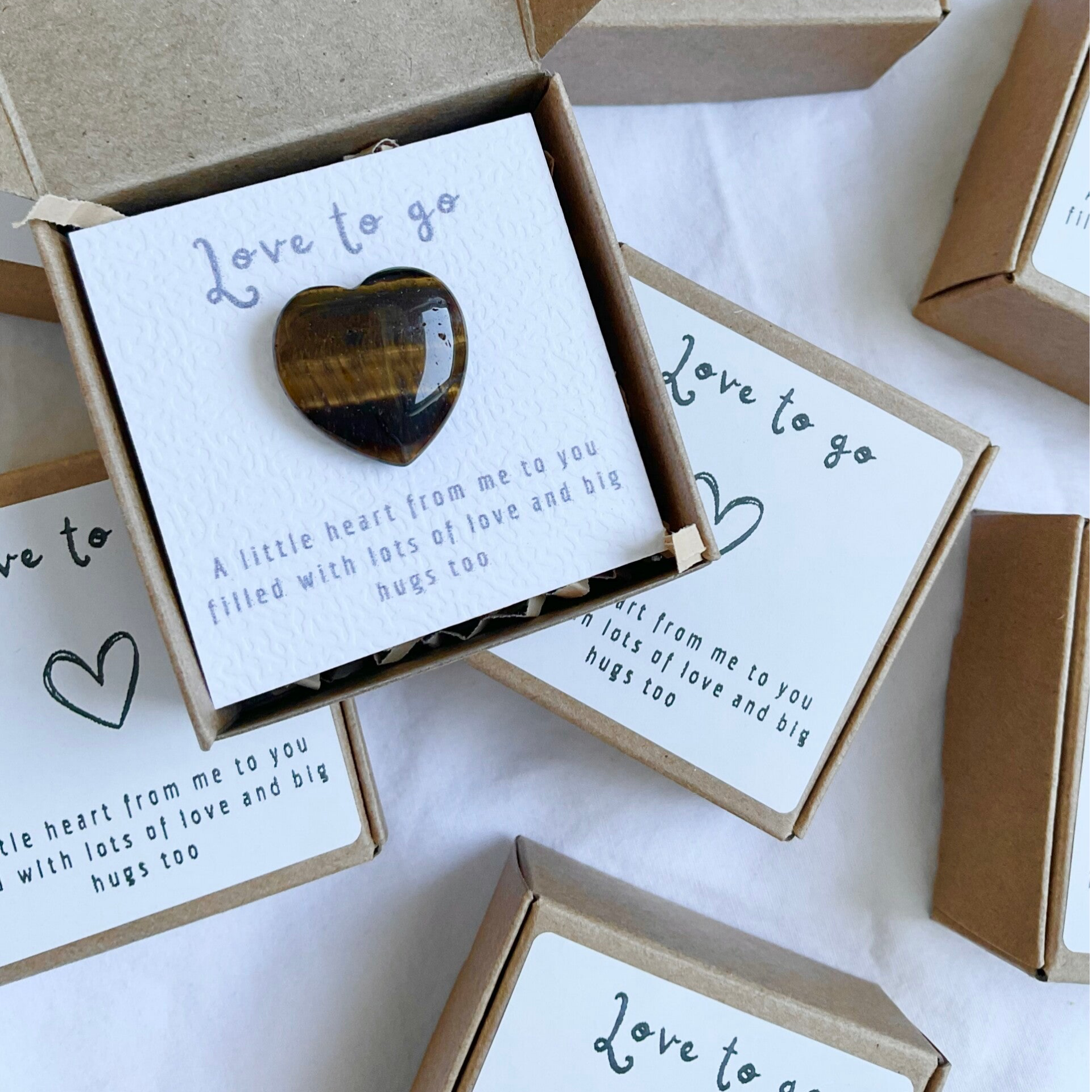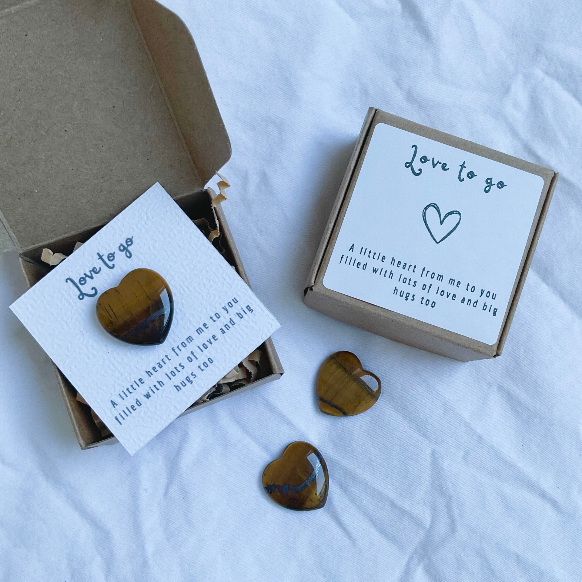 Een schattig klein doosje van 5 x 5 cm met een kaartje van geschept karton met een stenen hartje van tijgeroog. Je kunt het hartje van het kaartje afhalen om het bij je te dragen, in je zak. Maar ook mooi om het in het bewaardoosje een mooi plekje te geven.